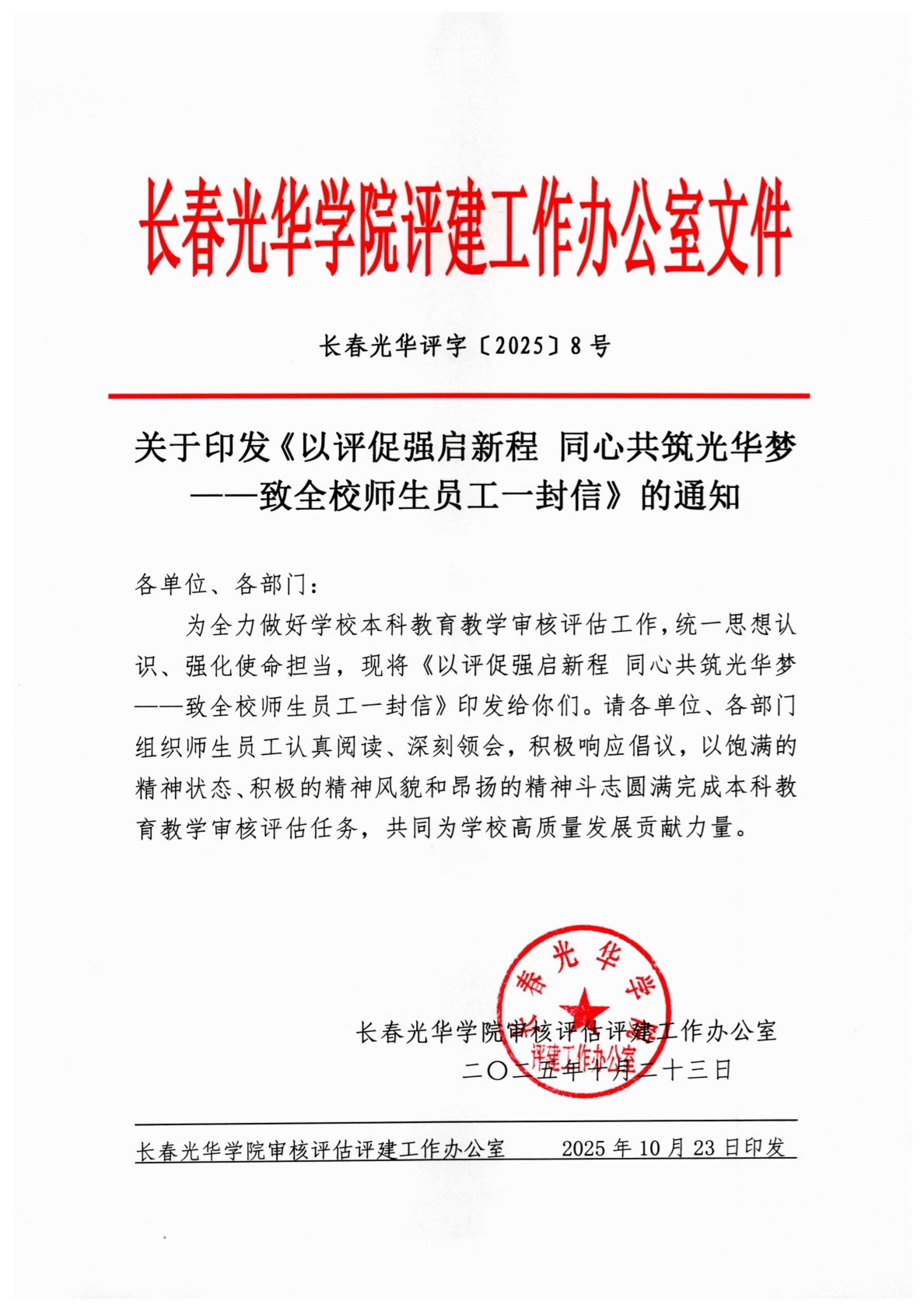 关于印发《以评促强启新程 同心共筑光华梦 ——致全校师生员工一封信》的通知